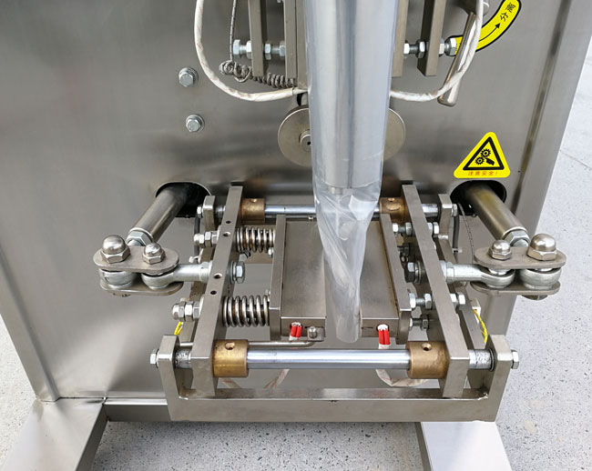 自动包装机械横封机构也采用凸轮机构实现。此外,使用弹簧来实现横封时的过渡和缓冲。横封机构由横封凸轮、横封杆、横封头、横封销、横封支架、横封弹簧、盖形螺母、底板 等零件组成。 了解了自动包装机的横封和纵封,我们对这种款式的自动包装机的主要工作流程有了更清晰的了解。物料由料斗送入,输送至料盘,包装纸由牵引辊牵引从卷简向纵封头输运,物料被包装纸包卷,在纵封头处实现纵封。经纵封后的物料继续向前输运,在横封头处横封。横封后,配输送带到物料盘即可完成包装。