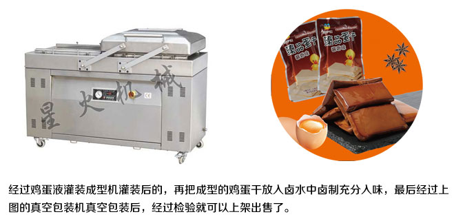 鸡蛋干是很近几年才流行起来的一种食物,以鸡蛋为原料通过蛋液灌装成型机成型、然后通过真空包装机,就成了市面流行的携带方便,且高营养价值的时尚休闲食品-鸡蛋干,国内知名的鸡蛋干品牌有:良品铺子、沈师傅、梅香、三只松鼠、祖名、润成、百草味、蜀道、香来伊份、波力、南国、徐福记等鸡蛋干食品生产企业。