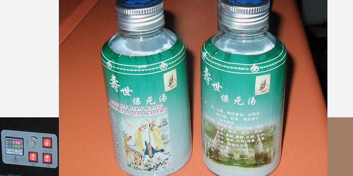 焦作包装机械之-金年会金字招牌信誉BS系列热收缩包装机和电动轧盖机包装的寿世保元汤的样品图及BS系列热收缩包装机控制按钮的细节图。