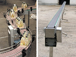 钢制链板输送机适用于形状不很规则物体的输送。在两条同链条上用板状构件连接使输送方向形成连续的平板,由于该输送机具有运行平稳的特点,与其他输送机配合使用可实现转角输送,载重能力很大能达到数十吨。