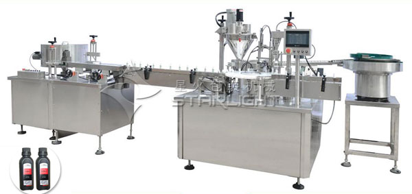 全自动粉剂灌装生产线针对瓶装的杀虫粉剂、兽药添加剂、鱼饵、兽药粉、医药粉剂等粉末的自动分装研制,该医药粉粉剂灌装生产线包含震动式理瓶机、自动定位灌装压盖机、铝箔封口机,圆瓶贴标机组成,自动化程度高,灌装速度快,是医药、食品、兽药等行业的小瓶粉剂分装必备的全自动粉剂灌装生产线,设备配置自动洗瓶、烘干功能,实现瓶子的清洗、烘干、灌装上盖,自动旋盖功能,一气呵成,避免污染,符合国家新版GMP要求。