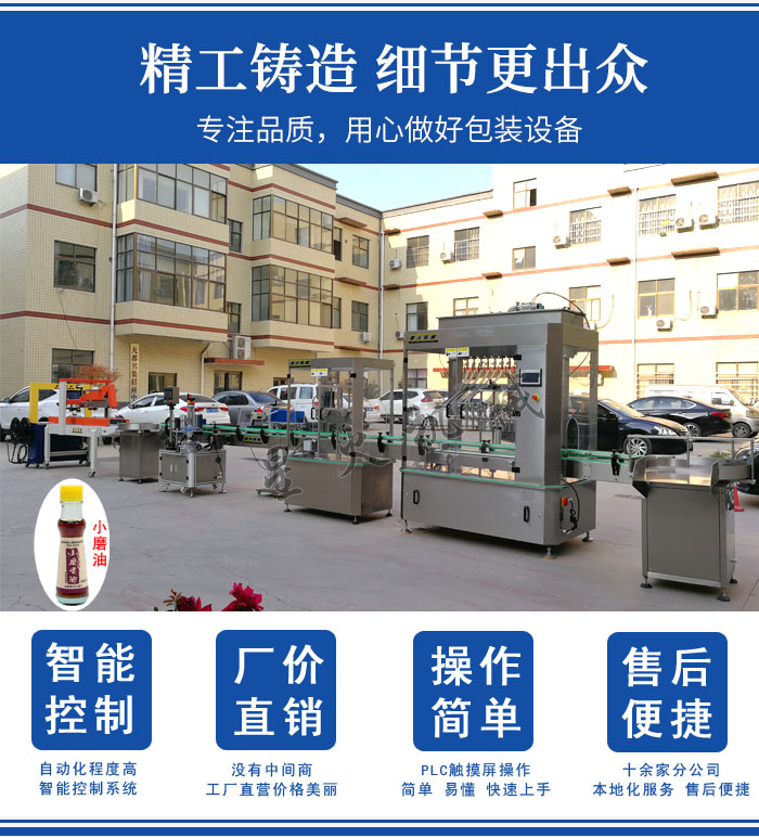小磨油灌装机生产线由理瓶机、全自动香油灌装机、压盖机、喷码机、香油瓶锥形标定位贴标机、自动封箱打包机组成,整线自动化程度高,灌装速度快,定量准确,直线式输送带运输平稳,不倒瓶,可根据客户车间免费设计,也可设计为弯道输送,占地面积更小,方便了很多企业的使用生产。