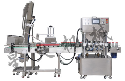 该全自动玻璃瓶旋盖机由XHZK-4抽真空旋盖机配套上盖机组成,专用于玻璃瓶的抽真空旋盖。